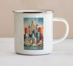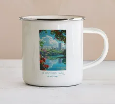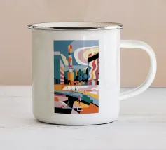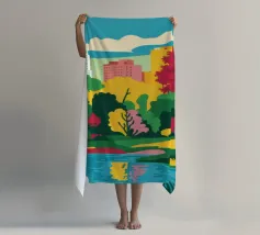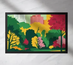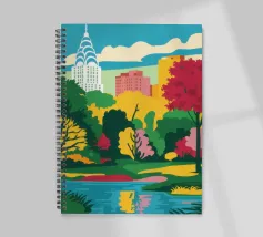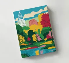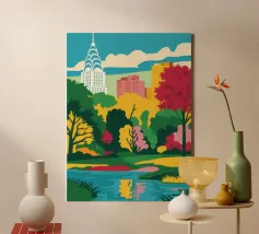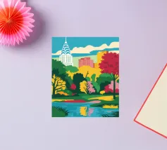 Un paesaggio vibrante di New York in autunno, con il Chrysler Building visibile dietro un fogliame autunnale colorato in un parco vicino a uno specchio d'acqua.