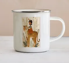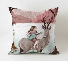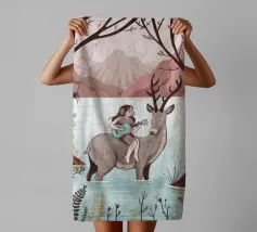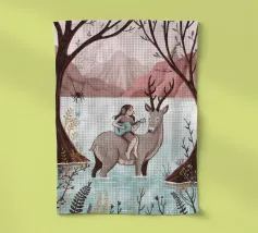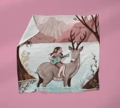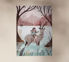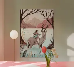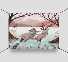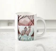 Un cavaliere intraprende un viaggio in cima a un maestoso cervo attraverso un paesaggio innevato. Le montagne lontane scintillano sotto un fresco cielo crepuscolare, evocando avventura e tranquillità.