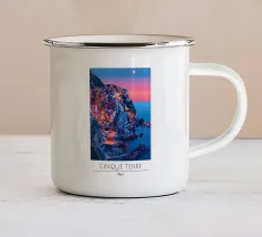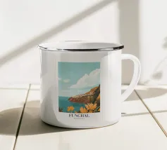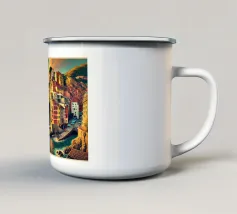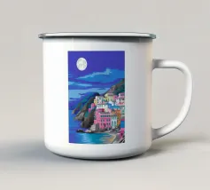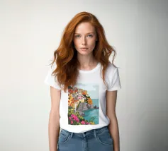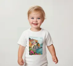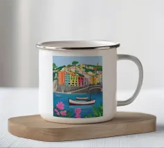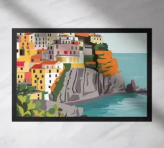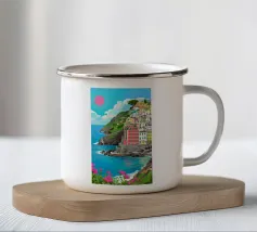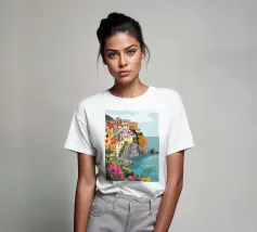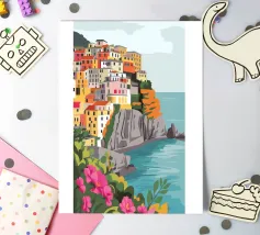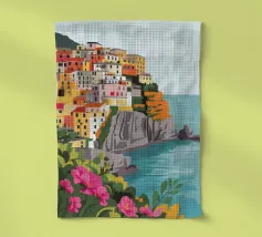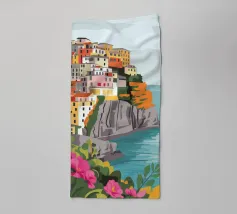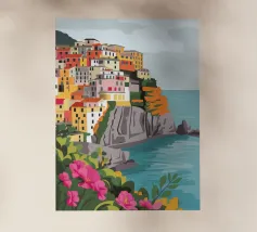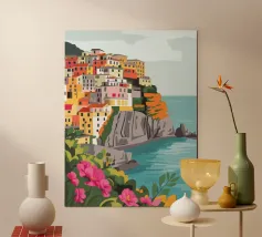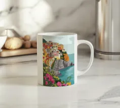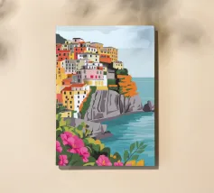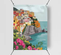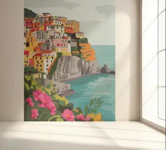 Una vista panoramica di un villaggio costiero incastonato tra le scogliere, con fiori vivaci in primo piano e il mare blu intenso che si estende all'orizzonte, catturando la bellezza di una fuga al mare.