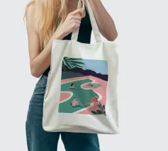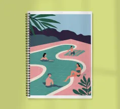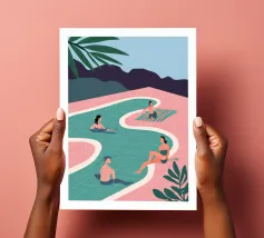 Un'illustrazione minimalista ed elegante di persone che si rilassano e nuotano in una piscina circondata da una vegetazione lussureggiante. Le linee pulite e l'atmosfera serena catturano perfettamente un momento di piacevole evasione estiva.