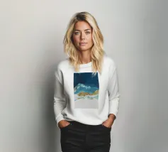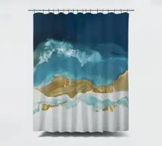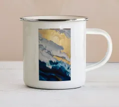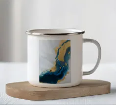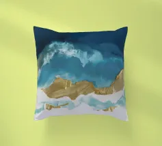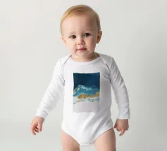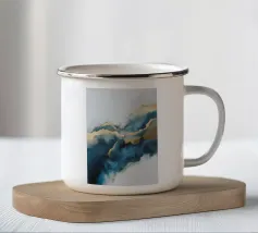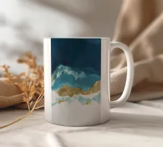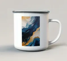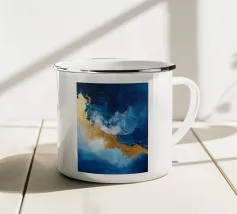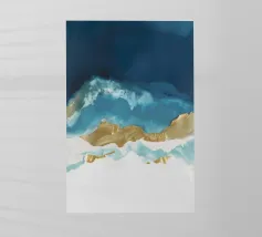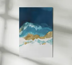 Una sorprendente composizione astratta con una netta divisione orizzontale tra un vibrante azzurro e un bianco incontaminato, accentuata da un'audace fascia strutturata di oro scintillante. Il pezzo emana un'eleganza moderna e un contrasto netto.