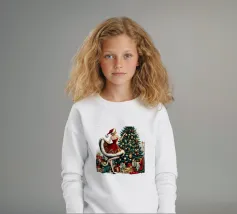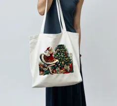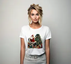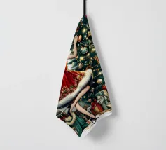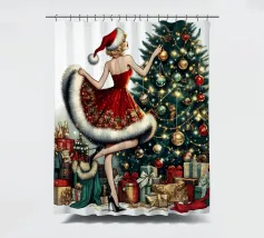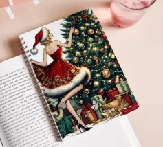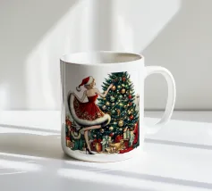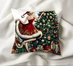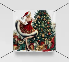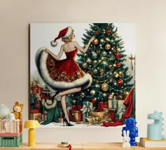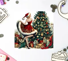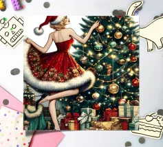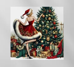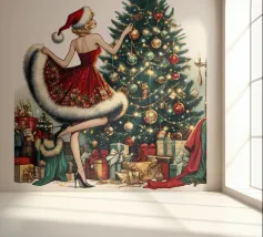 Illustrazione natalizia vintage retrò di una donna che addobba il suo albero di Natale con decorazioni, orpelli e luci fiabesche.