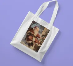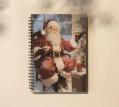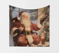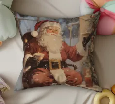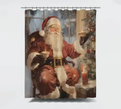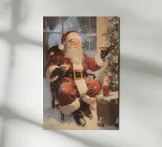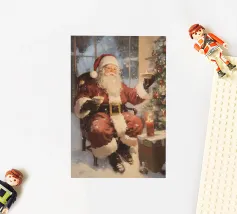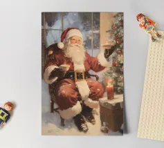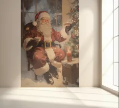 Un'accogliente scena natalizia con Babbo Natale seduto con una tazza in ogni mano, accanto a un albero di Natale decorato con ornamenti e luci, una candela accesa e un regalo incartato, su uno sfondo innevato.