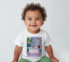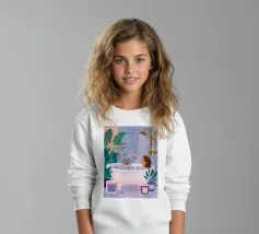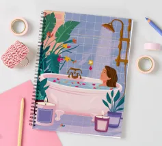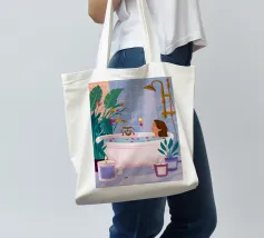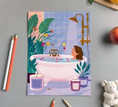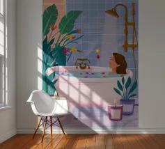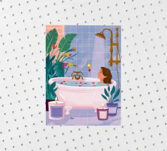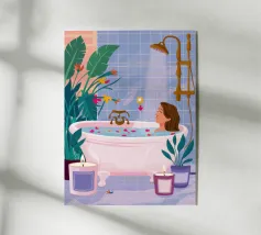 Illustrazione di due donne che si rilassano insieme in un bagno di schiuma, circondate da piante rigogliose. La scena è una rappresentazione intima, serena e bella della cura di sé e dell'amicizia condivisa.