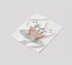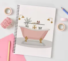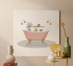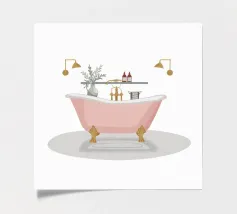 Illustrazione di una lussuosa vasca da bagno rosa con un vassoio di legno che contiene vari prodotti per la cura di sé. La scena è una rappresentazione chic, elegante e serena di un bagno perfetto e rilassante.