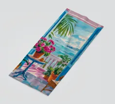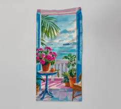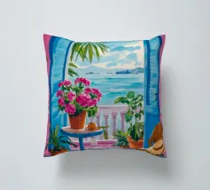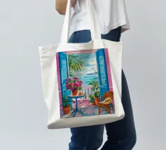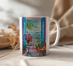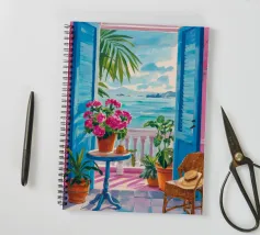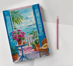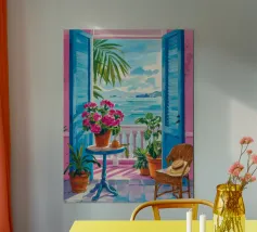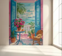 Una vista da un balcone con una chitarra e una sedia, che si affaccia su un mare bellissimo e ventilato con barche a vela. La scena rappresenta perfettamente una vacanza rilassata, creativa e idilliaca sulla costa.