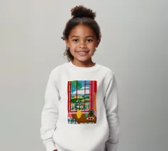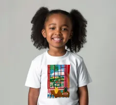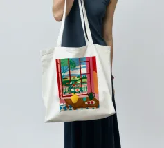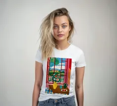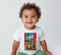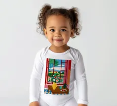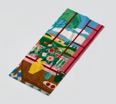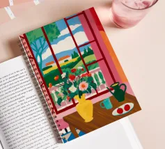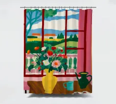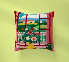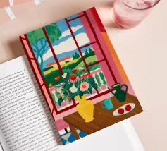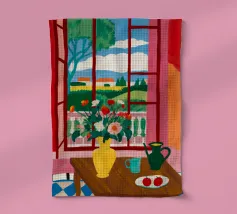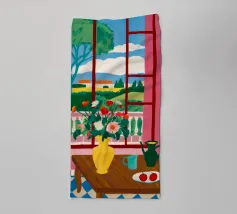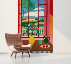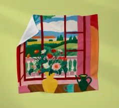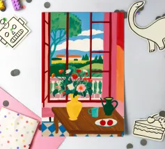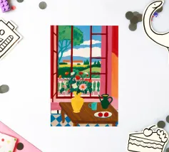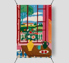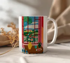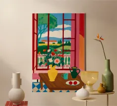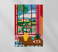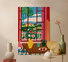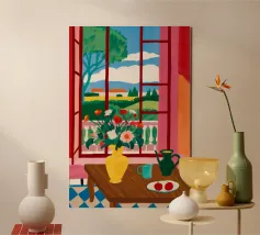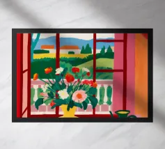 Una scena di balcone illuminato dal sole con tavolo rosso, caffettiera e fiori, che si affaccia su un paesaggio vivace attraverso una finestra aperta, trasmettendo un'atmosfera mattutina allegra.