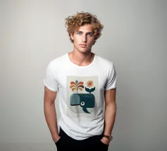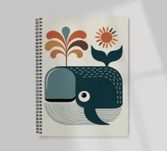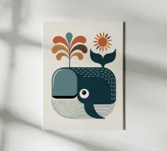 Un'allegra balena soffia un getto d'acqua arcobaleno sotto un sole radioso. Questo disegno grafico e colorato in stile moderno e retrò è perfetto per un arredamento per bambini allegro e pieno di energia. Ideale per gli amanti degli animali marini, delle forme stilizzate e delle atmosfere estive. Un'illustrazione che unisce divertimento, creatività e spirito oceanico in un look moderno e di tendenza.