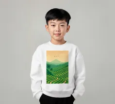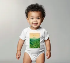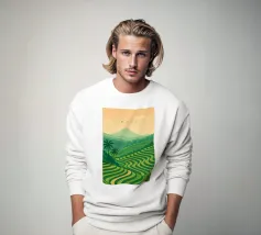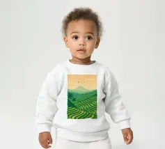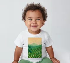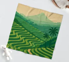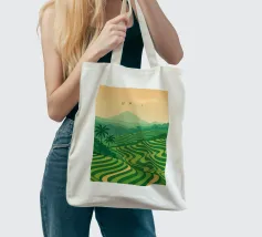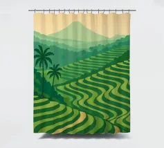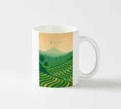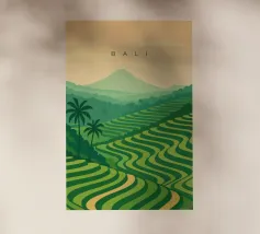 Poster di viaggio minimalista con splendide terrazze di riso per tutti coloro che amano la natura dell'Indonesia con le sue splendide spiagge, le piante esotiche, la fauna selvatica e i vulcani. Illustrazione stilizzata di campi di riso a Bali.