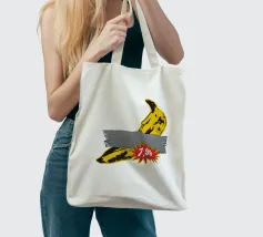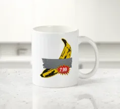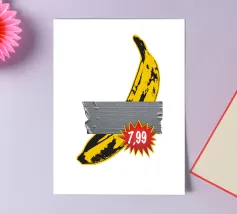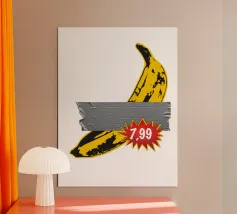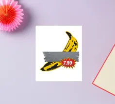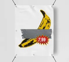 Una banana stilizzata è parzialmente coperta da un pezzo di nastro adesivo, accompagnata da un'etichetta rossa con il prezzo "7,99". La combinazione di elementi suggerisce un commento giocoso sul consumismo o sul valore.