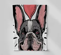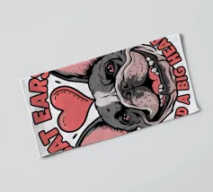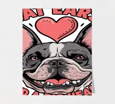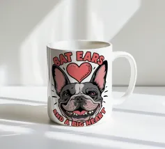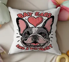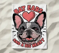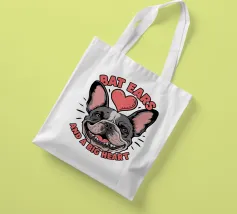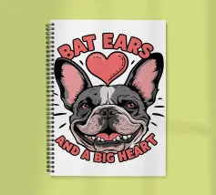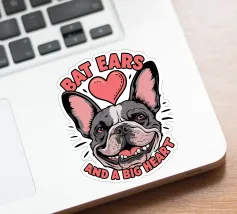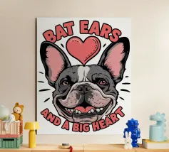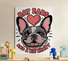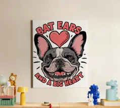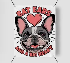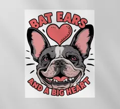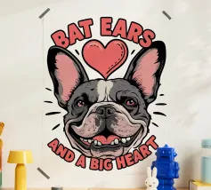Un allegro bulldog con grandi orecchie è circondato dal testo "BAT EARS AND A BIG HEART" (orecchie di pipistrello e un grande cuore) e ha un simbolo del cuore sopra la testa. Lo sfondo è grigio semplice e mette in risalto il design colorato e vivace del cane e del testo.