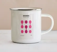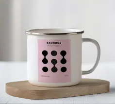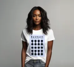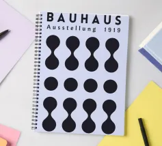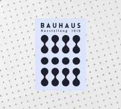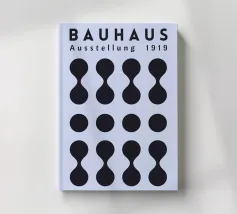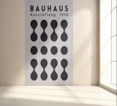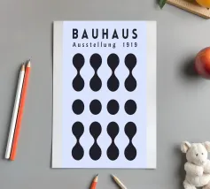 Iconica stampa di design grafico della mostra Bauhaus del 1919. Presenta forme geometriche nere solide, tra cui cerchi e forme arrotondate uniche, disposte in un sorprendente motivo simmetrico su uno sfondo azzurro rilassante. Incarna i principi del design minimalista, della forma geometrica e del chiaro blocco dei colori. File artistico digitale di alta qualità (7000x5000px, 300 dpi) perfetto per riproduzioni di grande effetto. Ideale arte murale moderna e vintage.