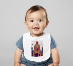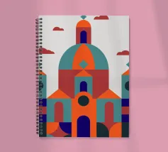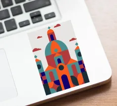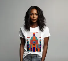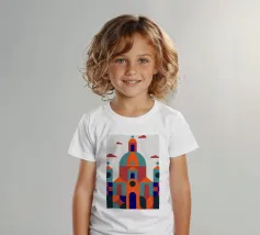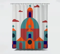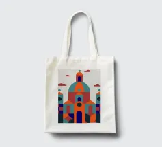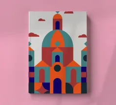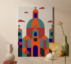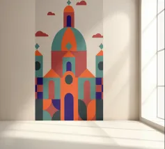 La rappresentazione geometrica di un edificio è caratterizzata da colori audaci e contrastanti come il verde acqua, l'arancione e il marrone, con forme astratte che alludono a elementi architettonici. Nuvole stilizzate fluttuano sopra, aggiungendo un tocco stravagante al disegno simmetrico.