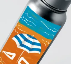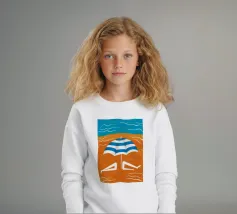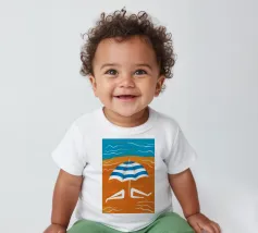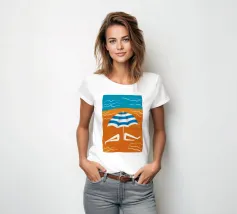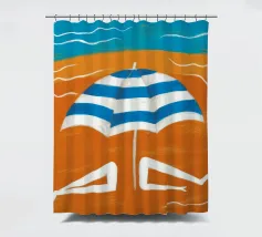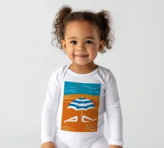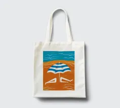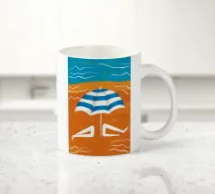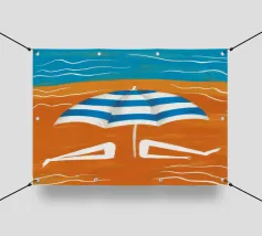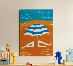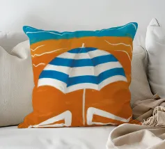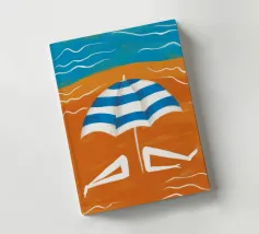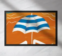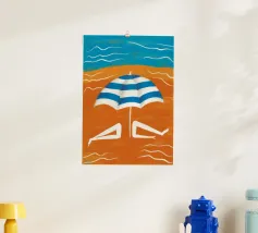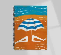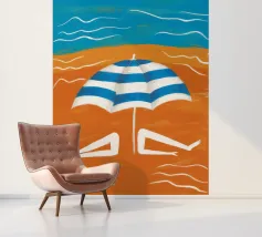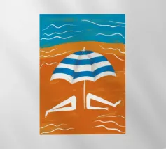 Una rappresentazione minimalista di una persona che si sdraia su una spiaggia arancione vibrante sotto un ombrellone a strisce bianche e blu, con il mare turchese sullo sfondo. L'immagine cattura perfettamente la beatitudine di una giornata solitaria in spiaggia.