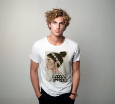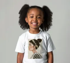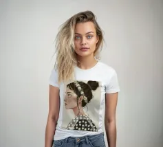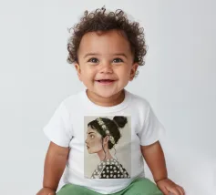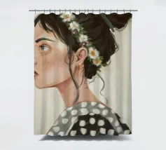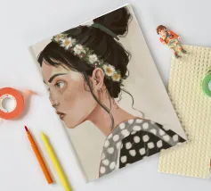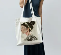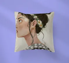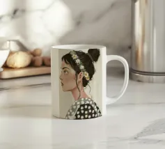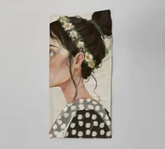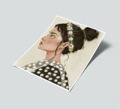 Questo dipinto raffigura una figura con capelli scuri legati in uno chignon, ornato da una fascia floreale. La figura è vestita con un abito a pois, su uno sfondo neutro, che trasmette un senso di calma e serenità.