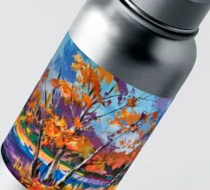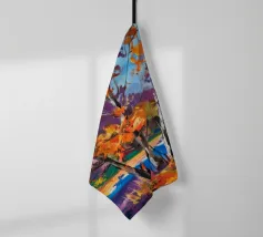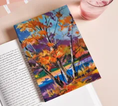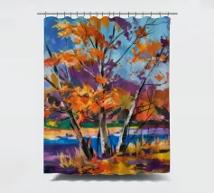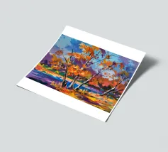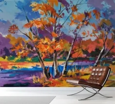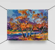 Un dipinto paesaggistico di betulle con fogliame autunnale giallo e arancione brillante, forse sullo sfondo di un lago o di un fiume. I colori sono intensi e infuocati.