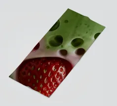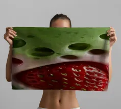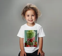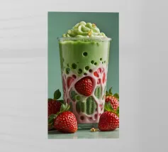 Una vivace bevanda a strati combina i colori verde e fragola, sormontata da panna montata e circondata da fragole fresche, creando una delizia invitante.