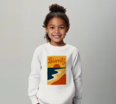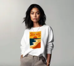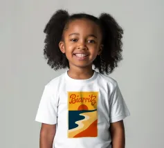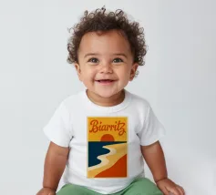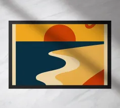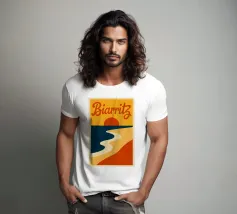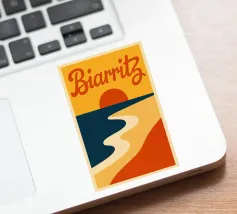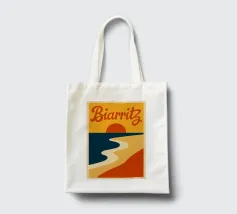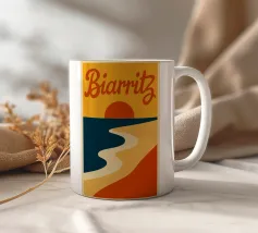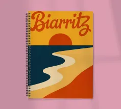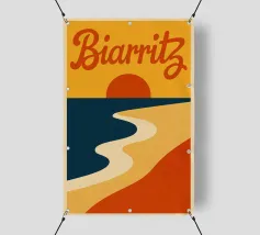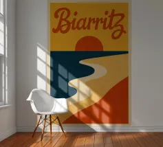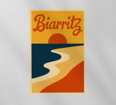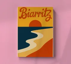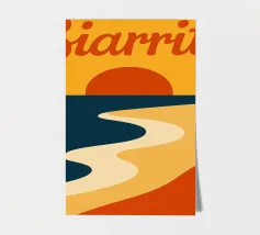 Minimalista, solare, ipnotico: questo poster celebra Biarritz con eleganza. Una spiaggia arancione, un mare blu notte e un sole al tramonto perfettamente circolare... il tutto disegnato con audaci toni piatti e dolci curve. È un'ode grafica alla dolce campagna basca, un mix di surf, design e nostalgia estiva.