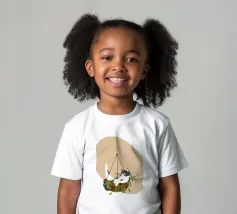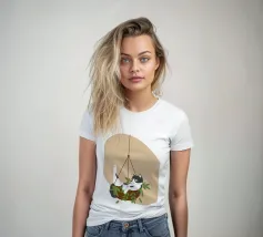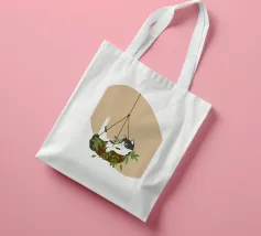 Un gatto bianco e nero si aggira giocoso in una fioriera sospesa con foglie verdi. Lo sfondo è caratterizzato da una semplice forma beige, che esalta l'atmosfera stravagante.