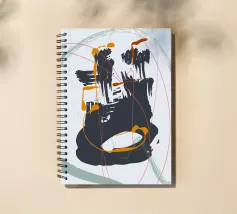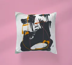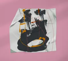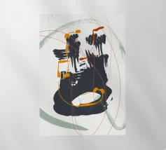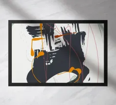 Audaci pennellate nere si intersecano con vorticose linee verdi e spruzzi di arancione, creando una composizione dinamica. Linee curve in toni morbidi si intrecciano tra le forme astratte, aggiungendo movimento e profondità all'immagine.