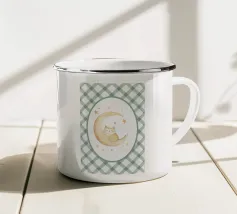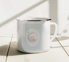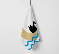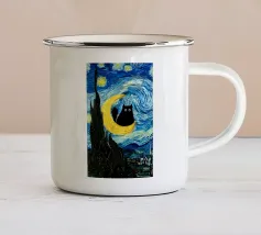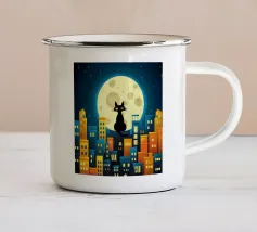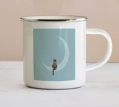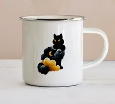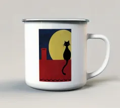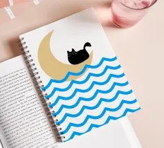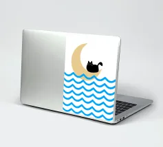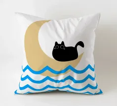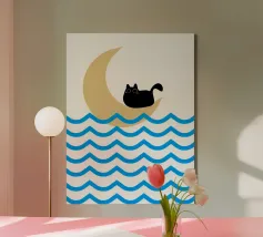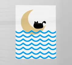 Un gatto nero siede in cima a una mezzaluna, fluttuando sopra una serie di linee blu ondulate che ricordano l'oceano. Il design minimalista utilizza colori vivaci per creare una scena stravagante e surreale.