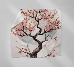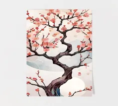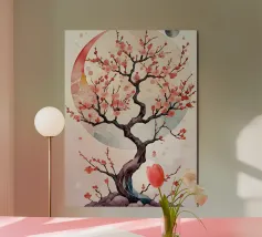 Un'accattivante pittura ad acquerello di un albero di ciliegio in fiore immerso nel tenue bagliore della luna crescente. I delicati petali rosa e i rami intricati creano un senso di tranquillità e bellezza.