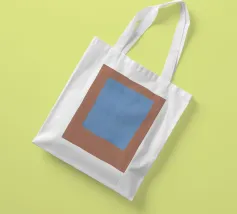 Un rettangolo azzurro di forma irregolare è centrato su uno sfondo color pesca a contrasto. Sulla superficie blu sono visibili sottili variazioni e texture che fanno pensare a un muro o a un pezzo di materiale dipinto.