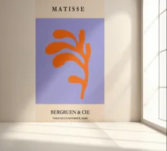 Questa stampa di ispirazione matissiana presenta un blu deciso e una foglia arancione che fondono forme organiche e colori sorprendenti per creare un disegno dinamico e vibrante. L'uso di toni contrastanti dona energia e vita a qualsiasi ambiente, rendendola un'aggiunta perfetta al soggiorno, all'ufficio o alla parete della galleria. La composizione giocosa ma elegante aggiunge un tocco moderno a qualsiasi spazio, catturando l'essenza dell'arte e della natura in modo contemporaneo.