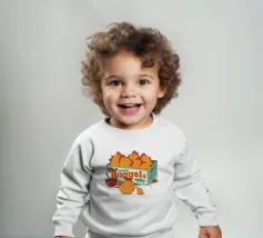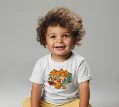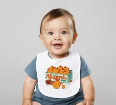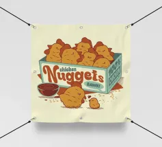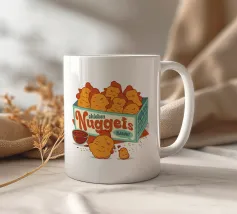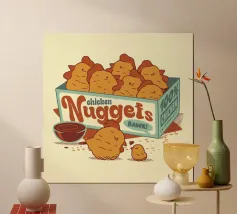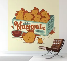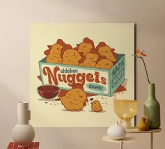 Una stampa che presenta una scatola di croccanti crocchette a forma di pollo, accompagnate da deliziose salse e da un pizzico di umorismo. Il vostro pasto preferito, con tanta simpatia e buonumore. Mostrate al mondo la vostra passione per le crocchette e aggiungete un pizzico di divertimento con una stampa unica.