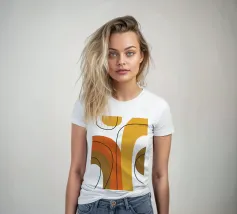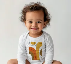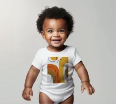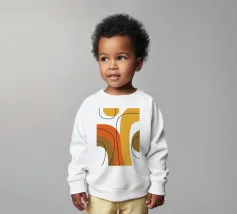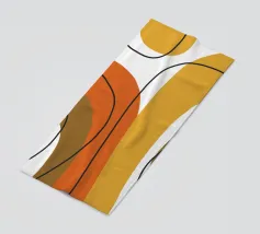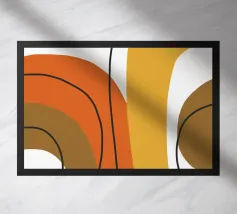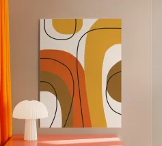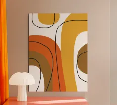 Forme audaci e curve nei toni dell'ocra, dell'arancio e del marrone creano un disegno astratto. I contorni neri accentuano il disegno fluido e scorrevole su sfondo bianco.