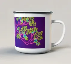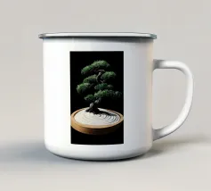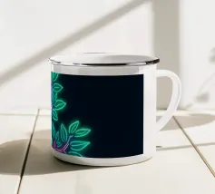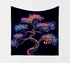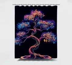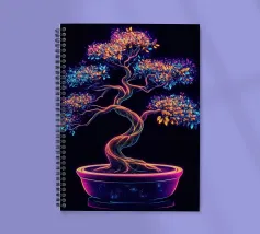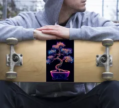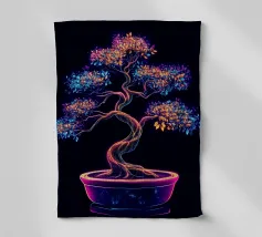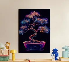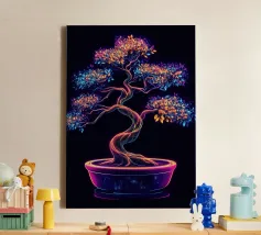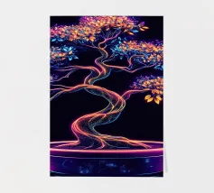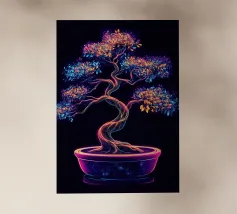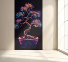 Un bonsai fatto di linee luminose al neon nei colori viola, blu, giallo e arancione si erge in una ciotola futuristica. Lo sfondo è di un nero profondo, che permette ai colori brillanti di emergere. Questo motivo unisce tecnologia e natura in modo moderno ed estetico.