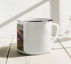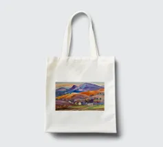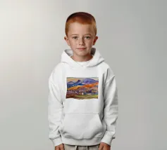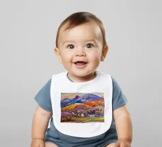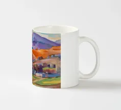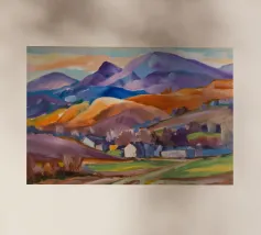 Un ampio paesaggio autunnale che mostra dolci colline nelle calde tonalità dell'arancione, del marrone e del giallo, con un piccolo e accogliente villaggio annidato nella valle sottostante e uno sfondo di lontane montagne azzurre.