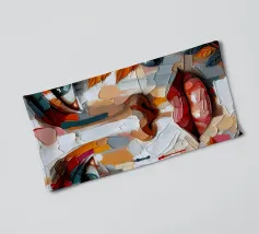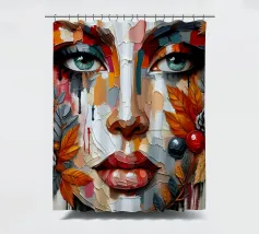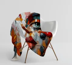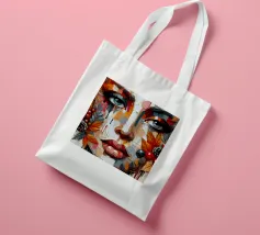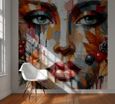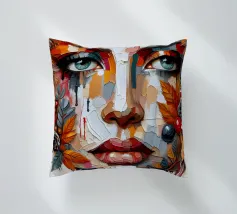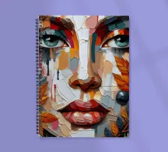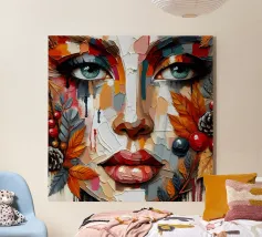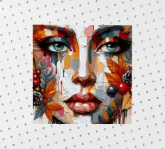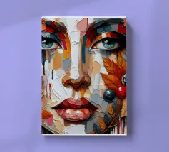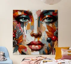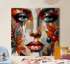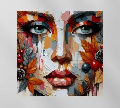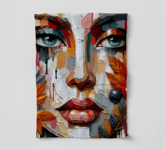 Un ritratto vibrante e materico del volto di una donna, realizzato in uno stile che ricorda la pittura a impasto, in cui vengono applicati spessi strati di pittura per creare un effetto tridimensionale. Il volto è composto da varie macchie di colore in tonalità calde come arancio, rosso e marrone, bilanciate da tonalità più fredde come blu e grigio.