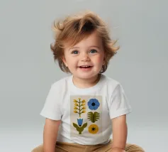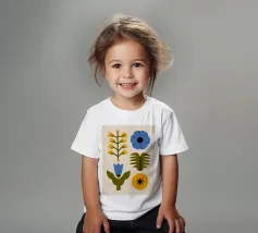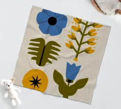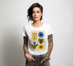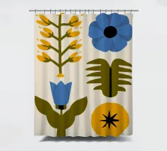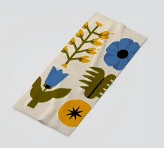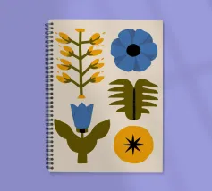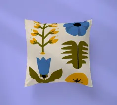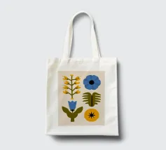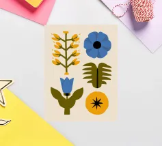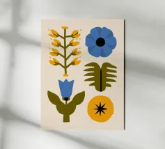 Una composizione minimalista di fiori e foglie stilizzati di arte popolare in una semplice tavolozza di blu, giallo e nero, che crea un design botanico affascinante e senza tempo.