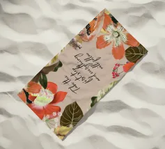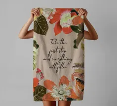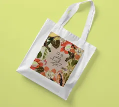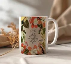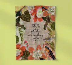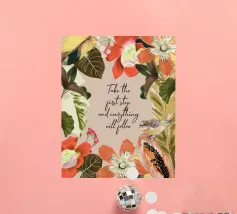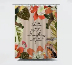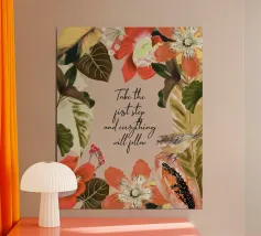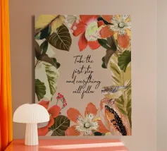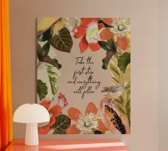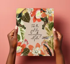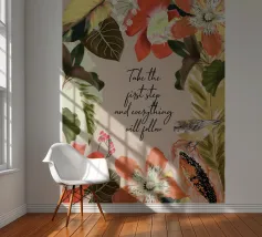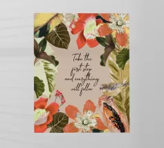 Citazione ispiratrice con fiori tropicali e cornice botanica.