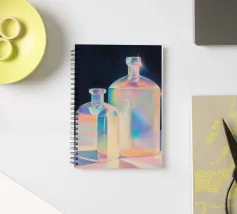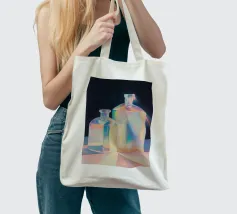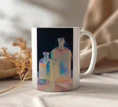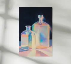 Ammirate la brillantezza delle bottiglie di vetro iridescenti in questa accattivante foto d'arte. Perfetta per un arredamento moderno e artistico.