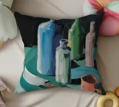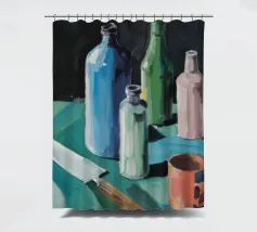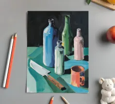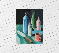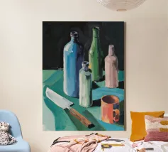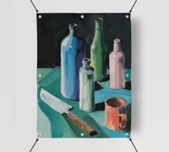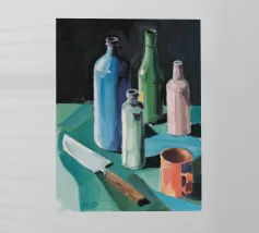 Diverse bottiglie di vetro, una tazza di ceramica e un grande coltello formano una natura morta in un'atmosfera di luce intensa.