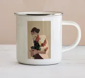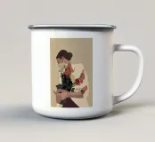 Ritratto di donna di profilo, che tiene vicino al viso un morbido bouquet di fiori. I toni calmi e i dettagli delicati conferiscono all'opera un'atmosfera tranquilla e intima.