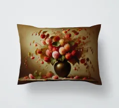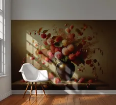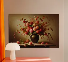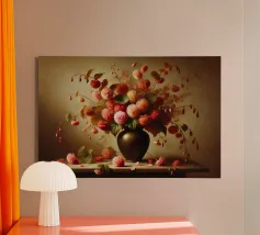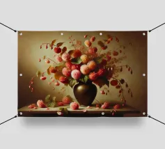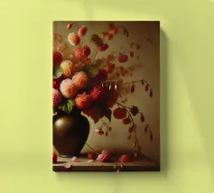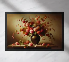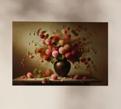 Raffinata stampa d'arte di ispirazione vittoriana che raffigura un lussureggiante bouquet di fiori disposti in un vaso ornato, dipinto in stile classico ad olio con ricchi dettagli ed eleganza senza tempo - perfetto per aggiungere fascino vintage e raffinatezza a qualsiasi interno.