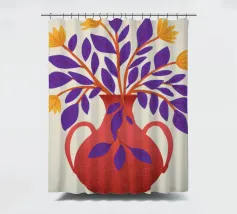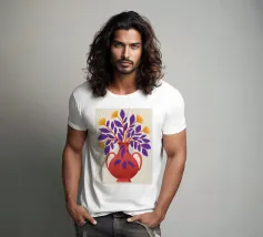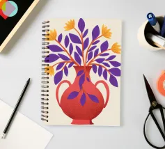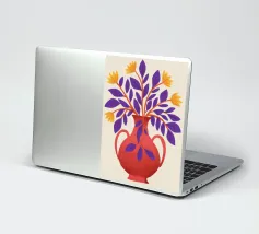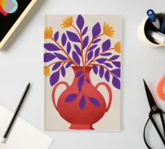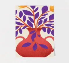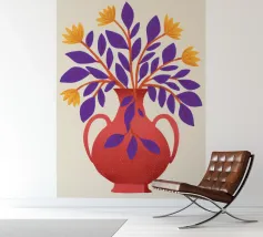 Una sorprendente natura morta presenta fiori viola e gialli in un audace vaso rosso, creando una composizione potente e artistica utilizzando una combinazione di colori primari.