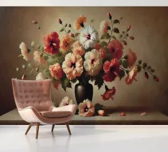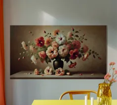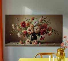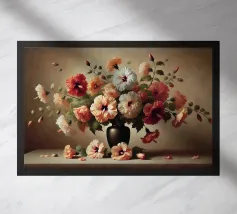 Raffinata stampa d'arte di ispirazione vittoriana che raffigura un lussureggiante bouquet di fiori disposti in un vaso ornato, dipinto in stile classico ad olio con ricchi dettagli ed eleganza senza tempo - perfetto per aggiungere fascino vintage e raffinatezza a qualsiasi interno.