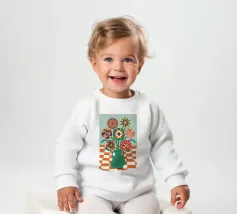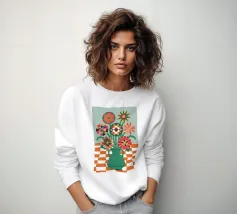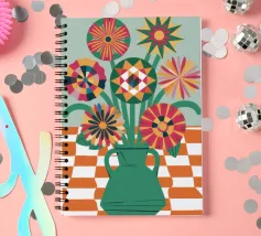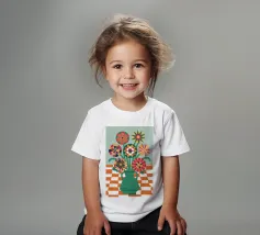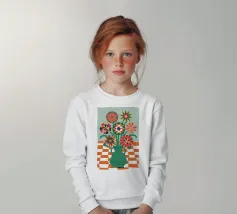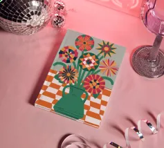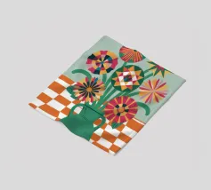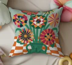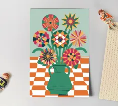 Una natura morta in stile arte popolare con un bouquet di fiori colorati e stilizzati in un vaso verde, su un pavimento a scacchi bianchi e verdi e una parete a motivi.