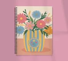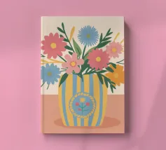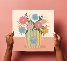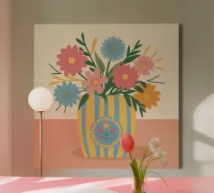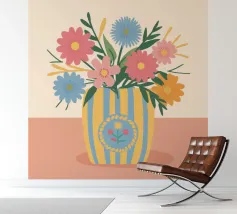 Un rigoglioso e colorato bouquet di fiori in un allegro vaso a righe bianche e gialle. La varietà di colori e il vaso luminoso creano un centrotavola allegro e vivace, perfetto per rallegrare qualsiasi ambiente.