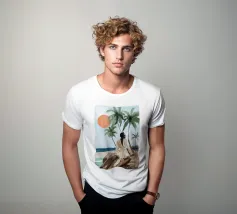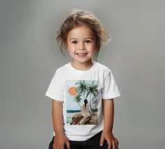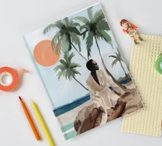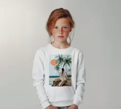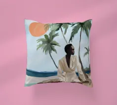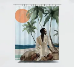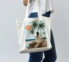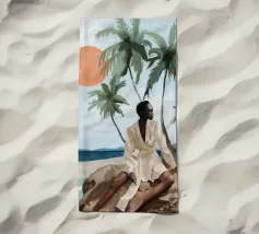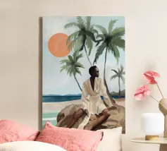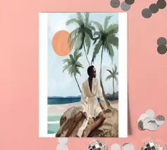 Grazioso dipinto digitale di una donna sicura di sé in una fluente vestaglia bianca seduta su una spiaggia rocciosa con palme e un vibrante sole arancione. Questa elegante e serena scena costiera evoca lusso, calma e vibrazioni tropicali. Perfetto per gli amanti della moda, dell'arte moderna e dell'arredamento tropicale. Aggiunge raffinatezza e calore a soggiorni, camere da letto e uffici. Regalo ideale per i collezionisti d'arte e gli appassionati di ritratti contemporanei ispirati alla spiaggia.