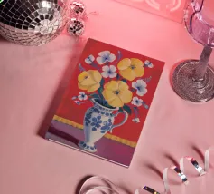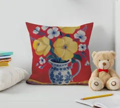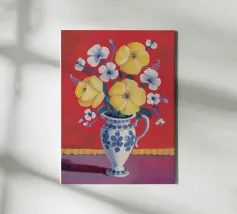 Un bouquet di fiori gialli brillanti con centro scuro è disposto in una brocca a motivi blu e bianchi. Lo sfondo è di un rosa tenue o lavanda, che mette in risalto la vivacità dei fiori gialli.