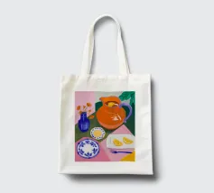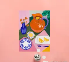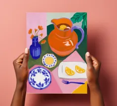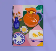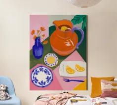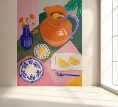 Una brocca arancione brillante domina un tavolo con limoni a fette, piatti e decorazioni vivaci.