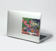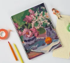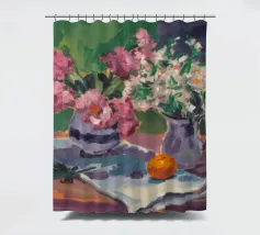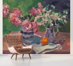 Un'allegra natura morta con un bouquet di fiori rosa tenero in una semplice brocca grigia, accompagnata da un arancione brillante e da altri elementi sottili su un piano da tavolo, su uno sfondo di colore verde acqua, molto vivace.
