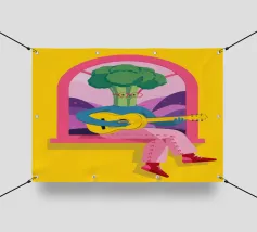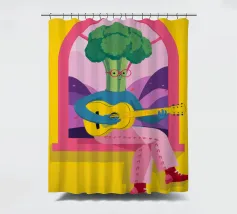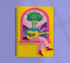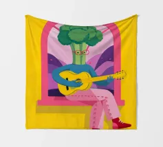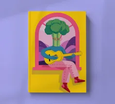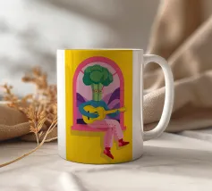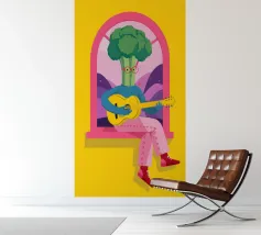 Un'illustrazione surreale e umoristica di una persona seduta in una finestra ad arco, che suona felicemente un ukulele fatto di broccoli. L'opera è fantasiosa, eccentrica e una celebrazione giocosa della creatività e dell'assurdità.