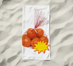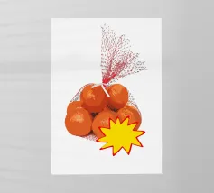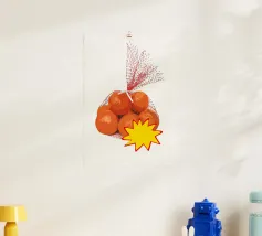 Un fascio di frutta arancione brillante è racchiuso in un sacchetto a rete rosso, con una stella gialla in bianco nell'angolo in basso a destra. Lo sfondo bianco accentua i colori vivaci dei frutti e il simbolo decorativo della stella.