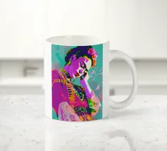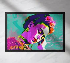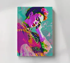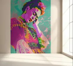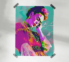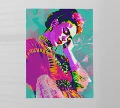 Questo vibrante e colorato ritratto di Frida Kahlo combina pop art e post-impressionismo in una composizione unica. Con colori al neon e audaci elementi grafici, cattura l'essenza della cultura e del folklore messicano in modo moderno.